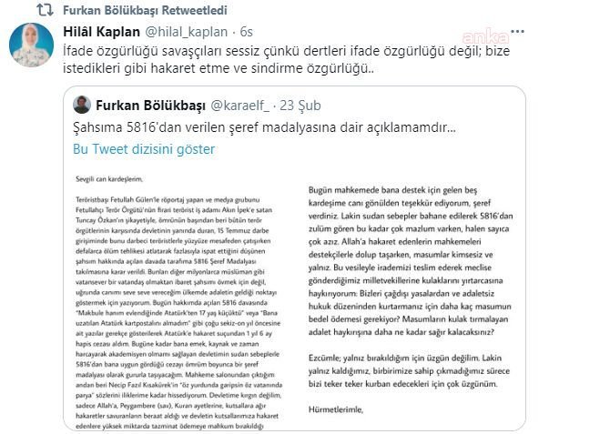 Marmara Üniversitesi ‘Araştırma Görevlisi’ Furkan Bölükbaşı, Ekşi Sözlük'te Mustafa Kemal Atatürk’e yönelik hakaret içerikli paylaşımları nedeniyle aldığı 1 yıl 6 ay 22 gün hapis cezasını “Şeref madalyası” olarak niteledi. Cezasında ‘İyi hal indirimi’ uygulanan Bölükbaşı, serbest bırakıldı.
