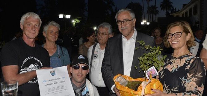 Resepsiyonda, ralliye Almanya’dan, tekerlekli sandalyede yardımcı pilot olarak katılan ve rallinin bütün etaplarını tamamlayan Markus Smadi, Almanya’dan getirdiği “barış gülü” olarak bilinen özel bir türü Cumhurbaşkanlığı bahçesine dikilmek üzere Cumhurbaşkanı Akıncı’ya sundu. Smadi, “barış gülü” ile birlikte yaşadığı bölgenin yerel yöneticilerinin imzaladığı sertifikayı da takdim etti.