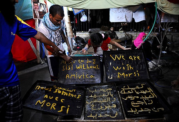 KAHİRE - Hazim Bedr Mısır'da başkent Kahire'nin doğusundaki Rabiatul Adeviyye Meydanı'nda gösterilerine devam eden demokrasi yanlıları, bayram için hazırladıkları kurabiyelerle, askeri darbeyle görevinden uzaklaştırılan Cumhurbaşkanı Muhammed Mursi'ye destek olmaya çalışıyor. Mısır'da bayramların vazgeçilmezi olan kurabiyeler, bu yıl evlerde değil Rabiatul Adeviyye Meydanı'nda yapılıyor. Meydanda kurulan fırınlarda pişirilen kurabiyeler "darbe karşıtı" yazılarla süsleniyor. Geleneksel olarak elde yuvarlak şekil verilerek hazırlanan kurabiyelerde bu defa İngilizce, Arapça ve Fransızca olarak "Meşruiyete evet, darbeye hayır", "Mursi tekrar dönecek", Mursi'yle beraberiz", "Hoşgeldin bayram güle güle Sisi" gibi mesajlar yer alıyor. Meydandaki kalabalığın kurabiyelere büyük ilgi gösterdiği gözlenirken, Mısırlı kadınlar, yaptıkları kurabiyelerle hem bayram geleneğini yerine getirdiklerini hem de Mursi'ye destek olmayı amaçladıklarını ifade ediyor. Yanlarındaki çocuklarıyla birlikte kurabiyeleri hazırlayan anneler, meydandaki platformdan duyurulan haberlere de uzak kalmamaya çalışıyor. Mısır'da geçici hükümetin darbe karşıtlarıyla pazarlıklar yaptığı, bu çerçevede bazı Müslüman Kardeşler Teşkilatı (İhvan) üyelerinin serbest bırakılacağı ve İhvan'a 3 bakanlık verileceği yönünde Mısır basınında yer alan haberler de meydanda espri konusu haline geldi. Muhammed Abdulkavi, eşinin Kahire'ye 100 kilometre uzaklıktaki Minufiye ilinden sadece kurabiye yapımına iştirak etmek için geldiğini belirterek, "Bizler meydanda kalmaktan rahatsızlık duymuyoruz ki İhvan'a verileceği iddia edilen 3 bakanlığı kabul edelim" diye konuştu.