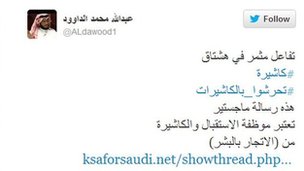 Sosyal paylaşım sitesi Twitter'da yaklaşık 100 bin takipçisi bulunan Abdullah Muhammed el-Davud, hafta sonunda gönderdiği mesajda 'kadın kasiyerleri cinsel olarak taciz edin' etiketini kullanınca yoğun tepki aldı.
