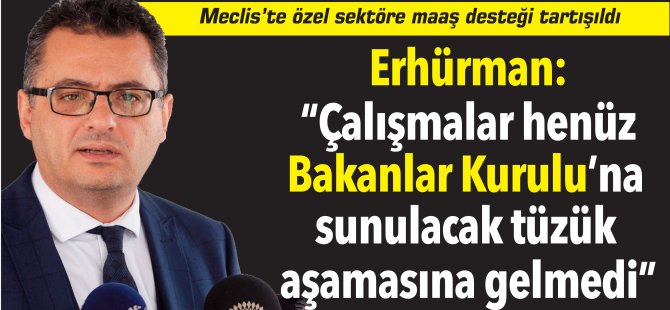 Başbakan Tufan Erhürman, özel sektör çalışanlarına ek maaş desteği konusundaki çalışmanın henüz tüzük taslağı şeklinde olduğunu ve Bakanlar Kurulu’nda onaylanacak aşamaya gelmediğini söyledi.