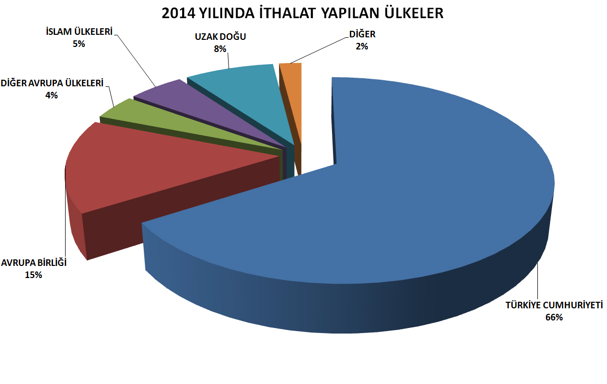 İthalat rakamları incelediği zaman ise dolgu sıva maddeleri, kiremit, LPG gazı, rafine edilmiş tuz, viski, zivaniya, tohumluk patates, gazete kağıdı ve canlı balıkların en çok ithal edilen ürünler olduğu saptandı. Öte yandan ithalat rakamlarında en çok satış yapılan ülkenin yüzde 66 oran ile Türkiye ilk sırayı alırken, Türkiye’yi Avrupa Birliği, Uzak Doğu ve İslam ülkeleri takip ediyor.
