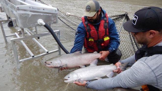 Somonlar daha sonra su tanklarıyla nehirde yumurtlayacacakları alanlara doğru yolculuklarına devam edebilecekleri bir bölgeye taşınacak.