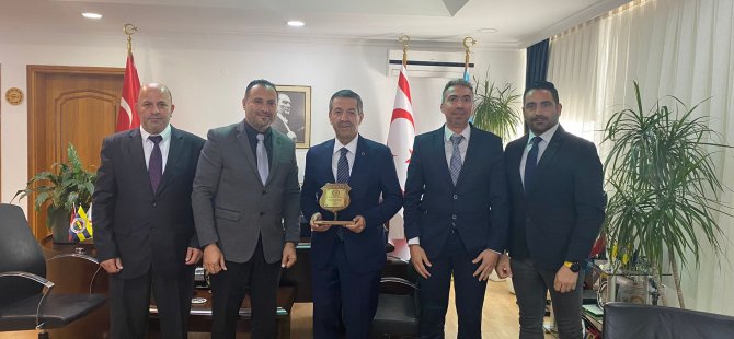 Kıbrıs Türk Spor Yazarları Derneği Başkanı Necati Özsoy ve yönetim kurulu üyeleri Dışişleri Bakanı Tahsin Ertuğruloğlu’nu makamında ziyaret etti.