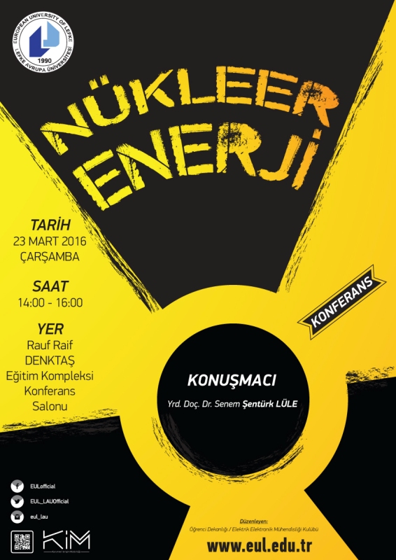 Lefke Avrupa Üniversitesi (LAÜ) Öğrenci Dekanlığı ve Elektrik Elektronik Mühendisliği Kulübü tarafından 23 Mart Çarşamba günü 14:00-16:00 saatleri arasında “Nükleer Enerji” konulu konferans düzenlenecek. LAÜ Rauf Raif Denktaş Eğitim Kompleksi Konferans Salonu’nda gerçekleşecek konferansa İstanbul Teknik Üniversitesi Öğretim Üyesi Yrd. Doç. Dr. Senem Şentürk Lüle konuşmacı olarak katılacak.