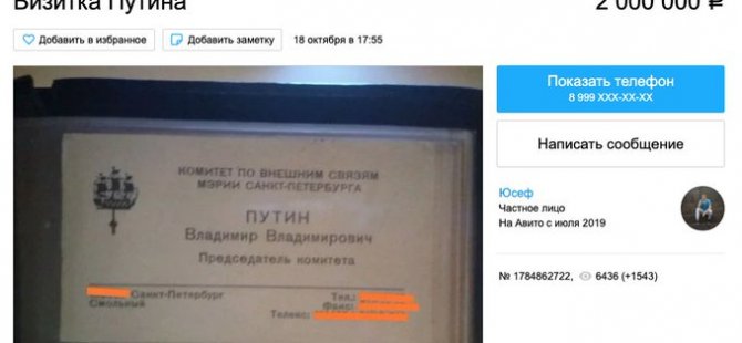 İnternet üzerinden hobi ve eğlence kategorisi altında satılan pek çok ünlüye ait eşya ve imza bulunuyor. Ancak 5000 görüntülenme alan kartvizitin satıcısı ile henüz iletişime geçilemedi.Birkaç hafta önce, Putin’in 1990’lı yıllarda Leningrad Belediye Meclisi üyesi olduğu dönemde kalma tamamıyla gerçek bir kartvizit de bir hafta önce 950 bin rubleye (yaklaşık 85.500 Türk lirası) satışa çıkarılmıştı.