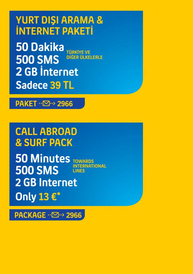 Tüm ülkelerle 50 dakika konuşma, her yöne 500 SMS (kısa mesaj) ve 2 GB internet keyfi içeren “Yurt dışı arama ve internet paketi”ne başvurmak için 600 kontör karşılığında PAKET yazıp 2966’ya SMS göndermenin yeterli olacağı belirtildi. Faturasız hat kullanan Kuzey Kıbrıs Turkcell müşterilerinin yeterli kontörleri olması durumunda bu paketten diledikleri kadar faydalanabilecekleri, herhangi bir sınır olmadığı da verilen bilgiler arasında.