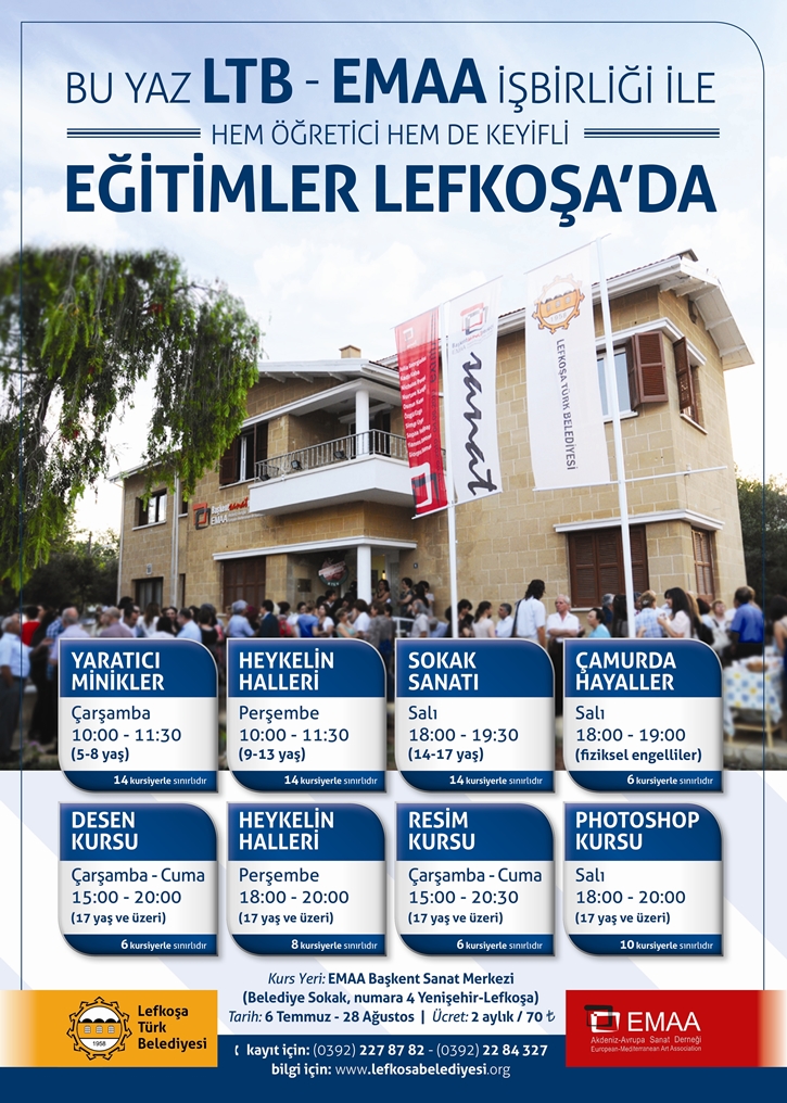 Akdeniz Avrupa Sanat Derneği (EMAA) gelenekselleşen yaz kurslarına başlıyor. Lefkoşa Türk Belediyesi (LTB) ile EMAA işbirliğinde gerçekleştirilecek olan kurslar, Temmuz’un ilk haftası başlayacak ve iki ay sürecek.